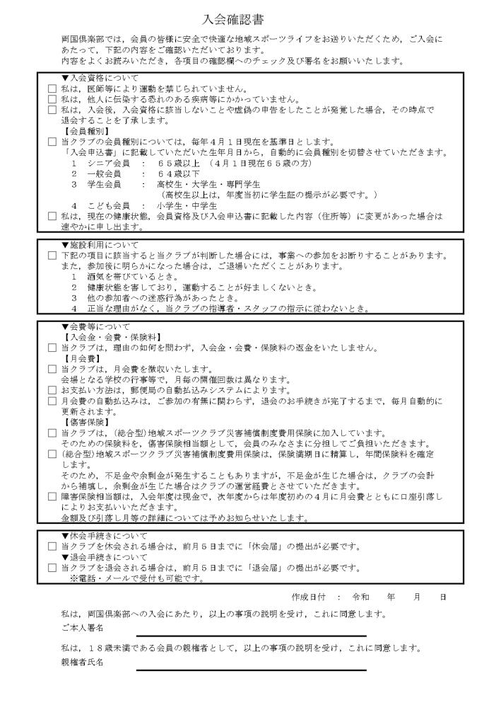 当倶楽部は、入会の際は以下入会確認書をお読みいただき、署名をお願いしております。